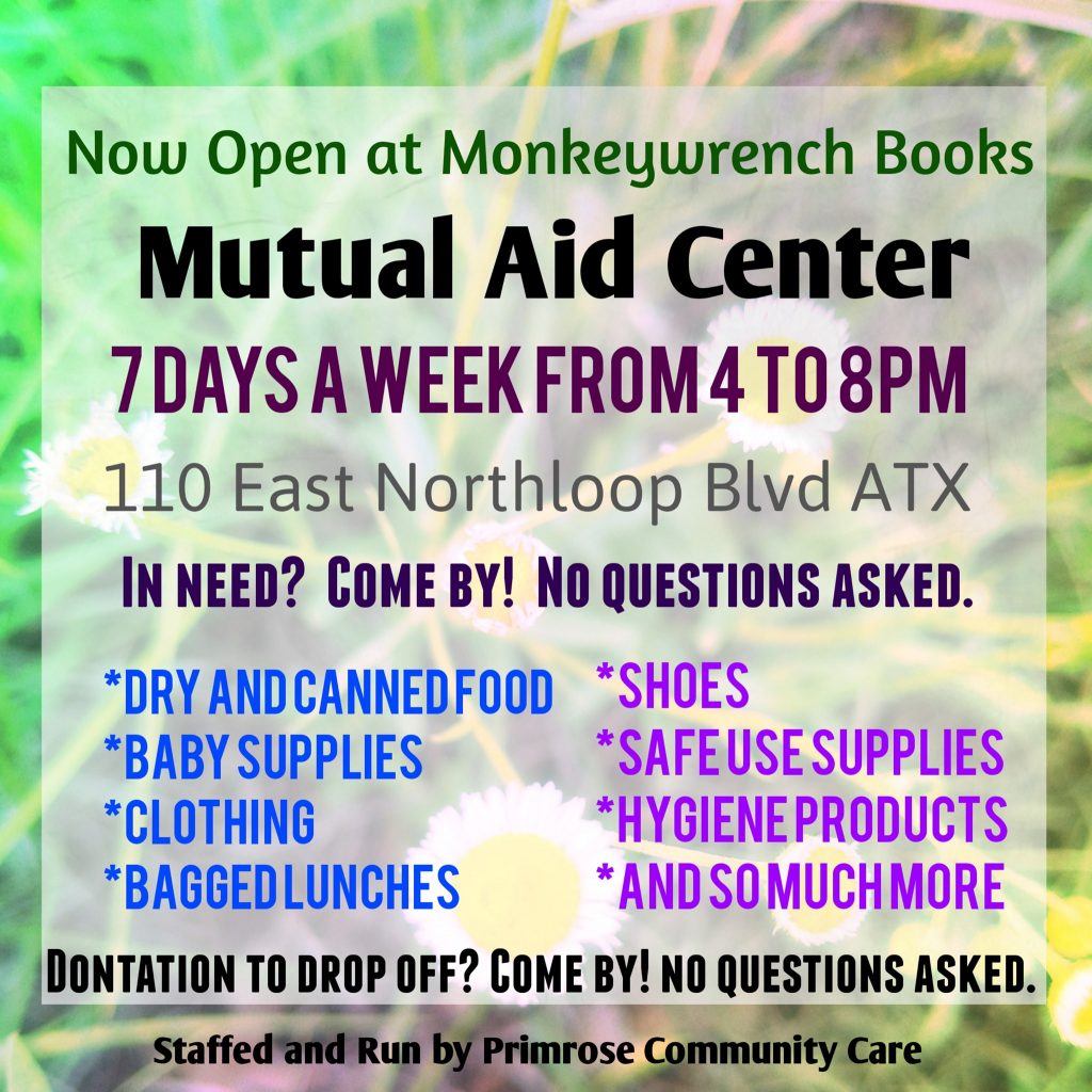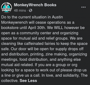 - Monkeywrench Books is offering their space as a community center and organizing space for mutual aid/relief groups, while ceasing operations as a bookstore. Contact them via their website, facebook, or at 512-766-6925. They additionally now have open drop-in hours for you to pick up supplies you need or drop off donations, daily from 4-8 PM.